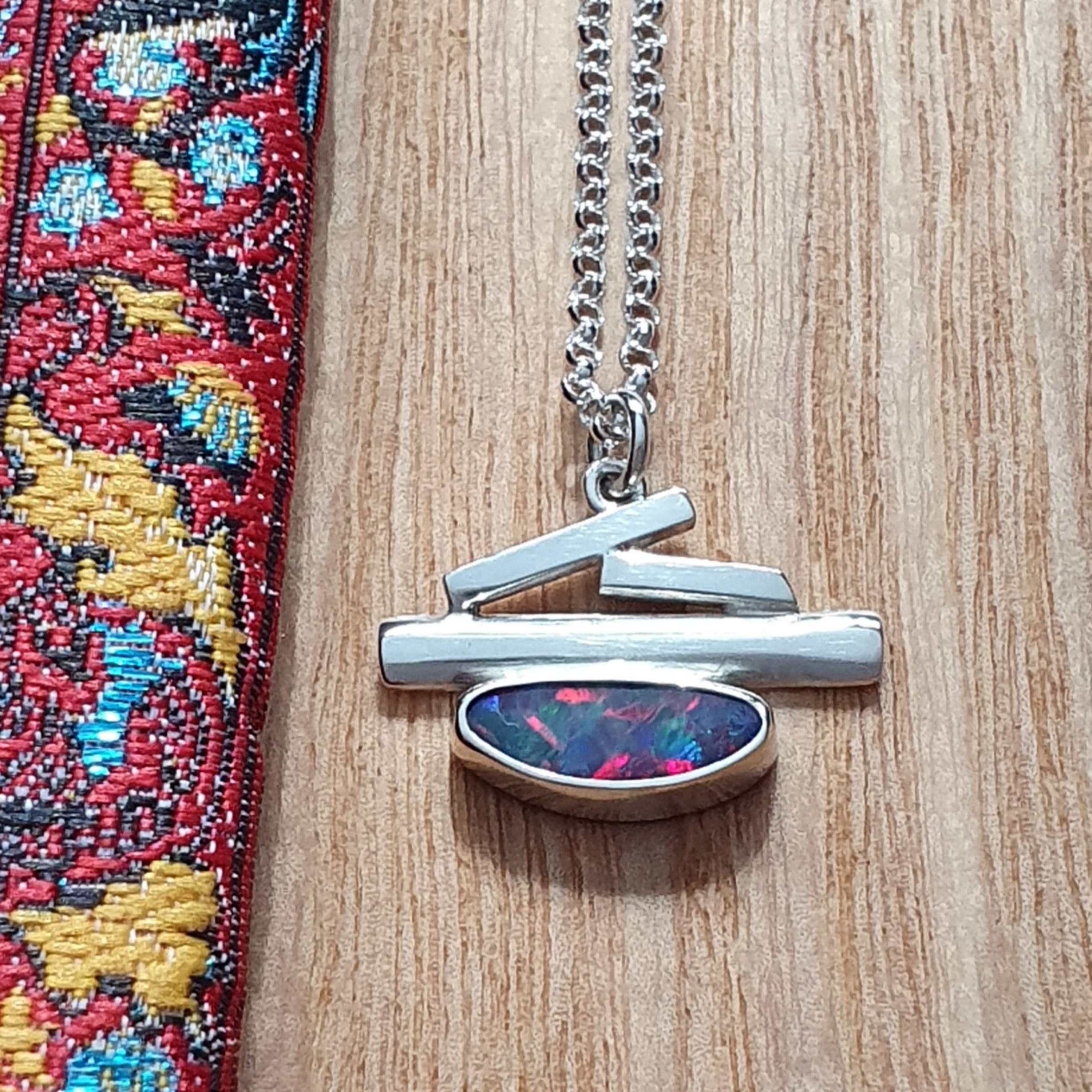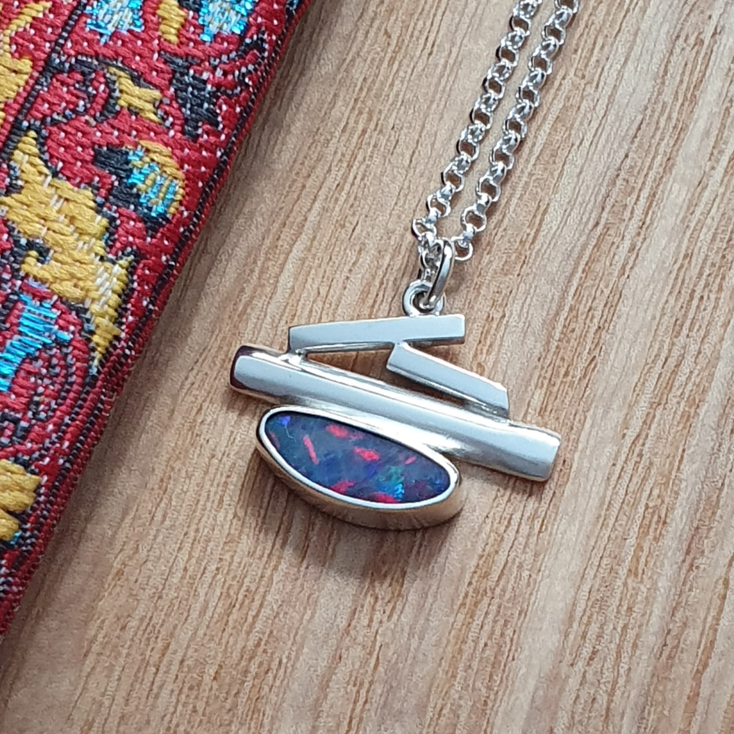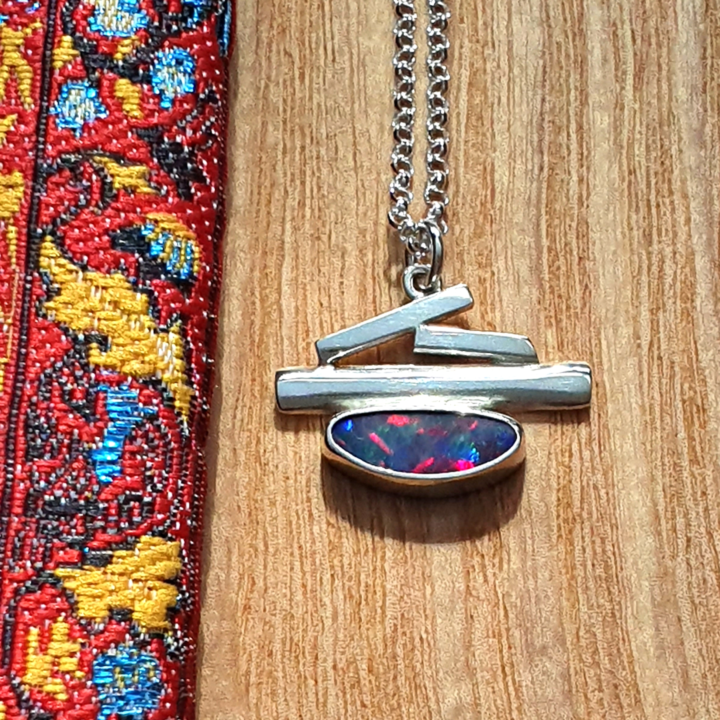 Sterling silver and red and blue Australian Opal doublet pendant on chain, handmade by Flying Lobster Jewellery. Opal 11 x 3.5mm. Length 17 x width 19mm. Chain 45cm. SW1417