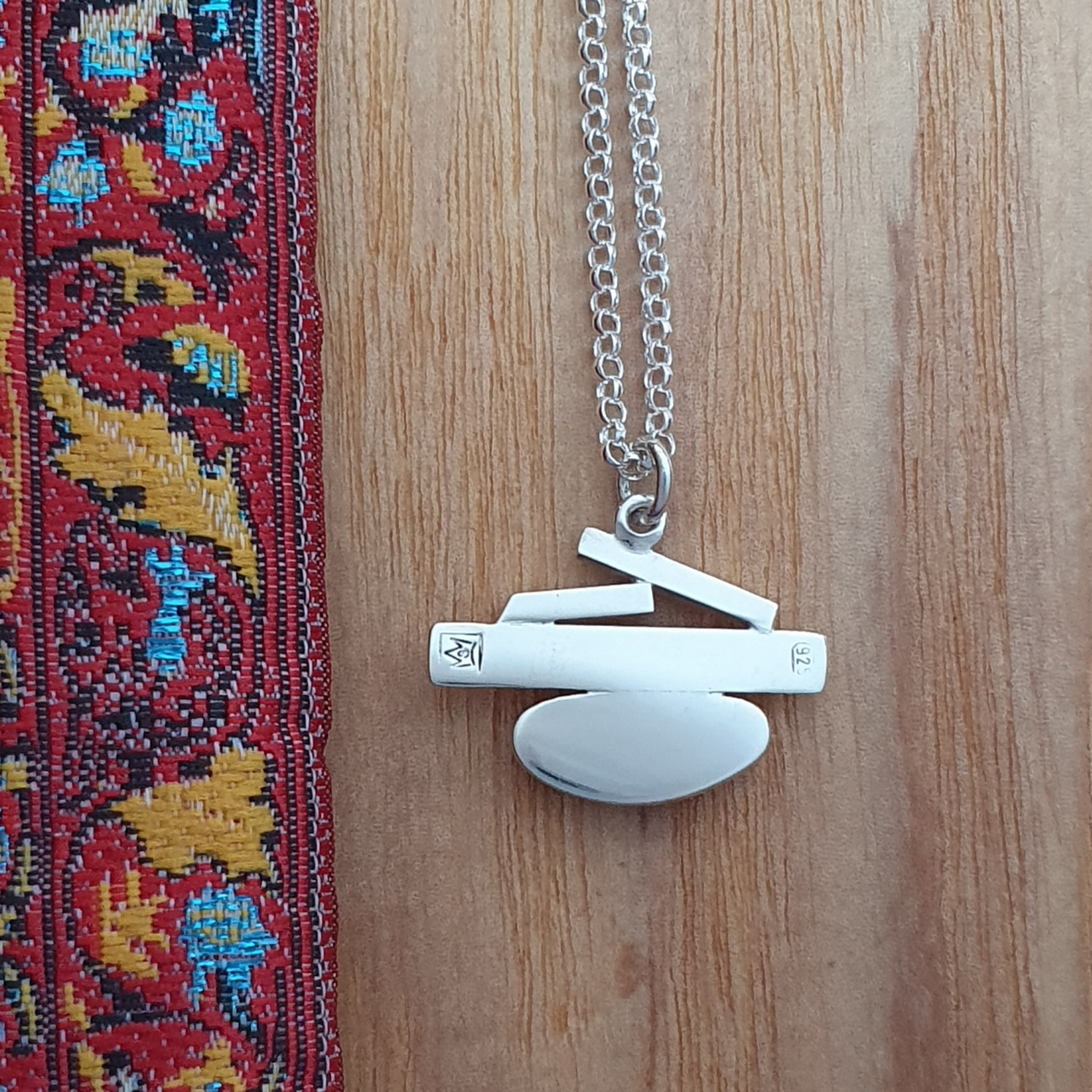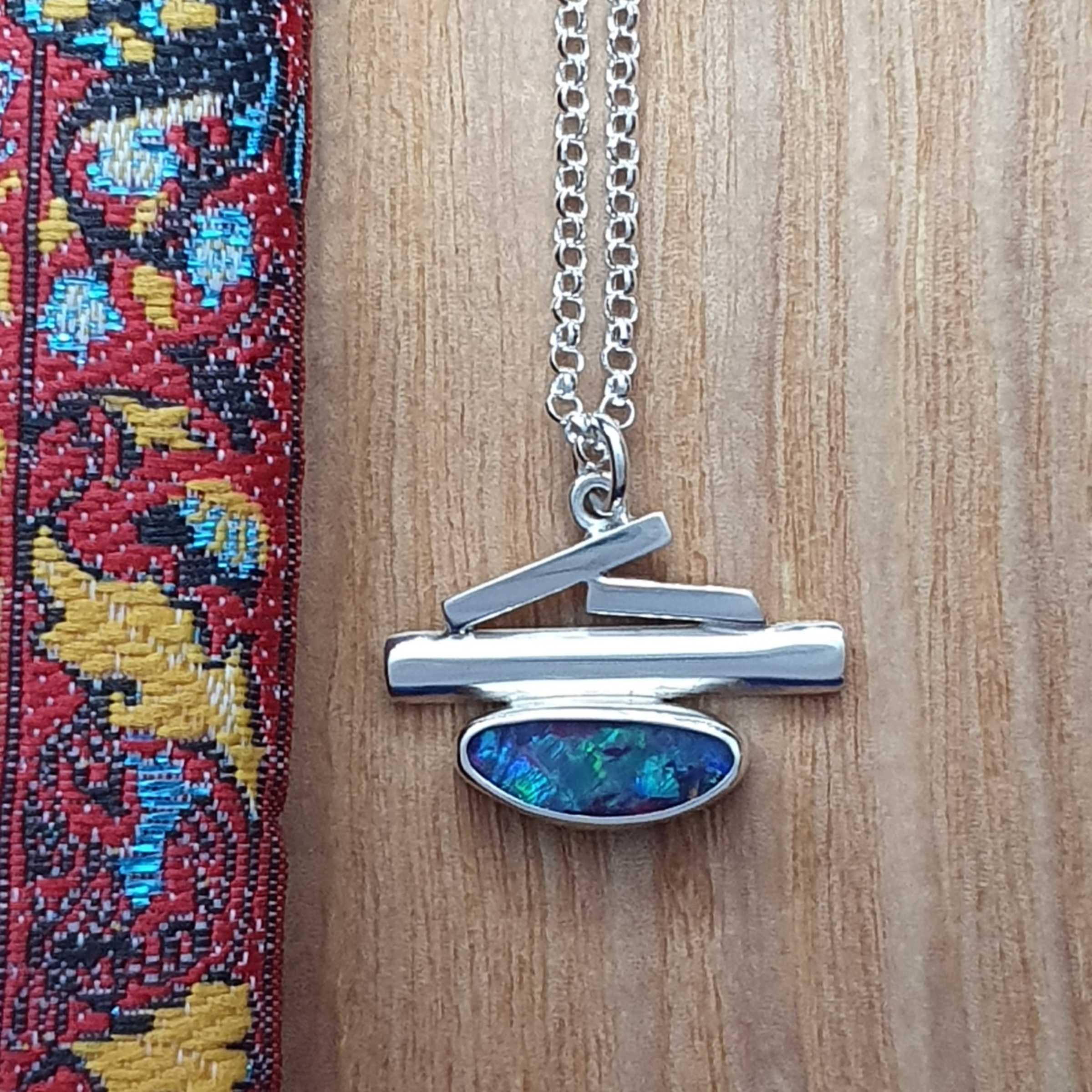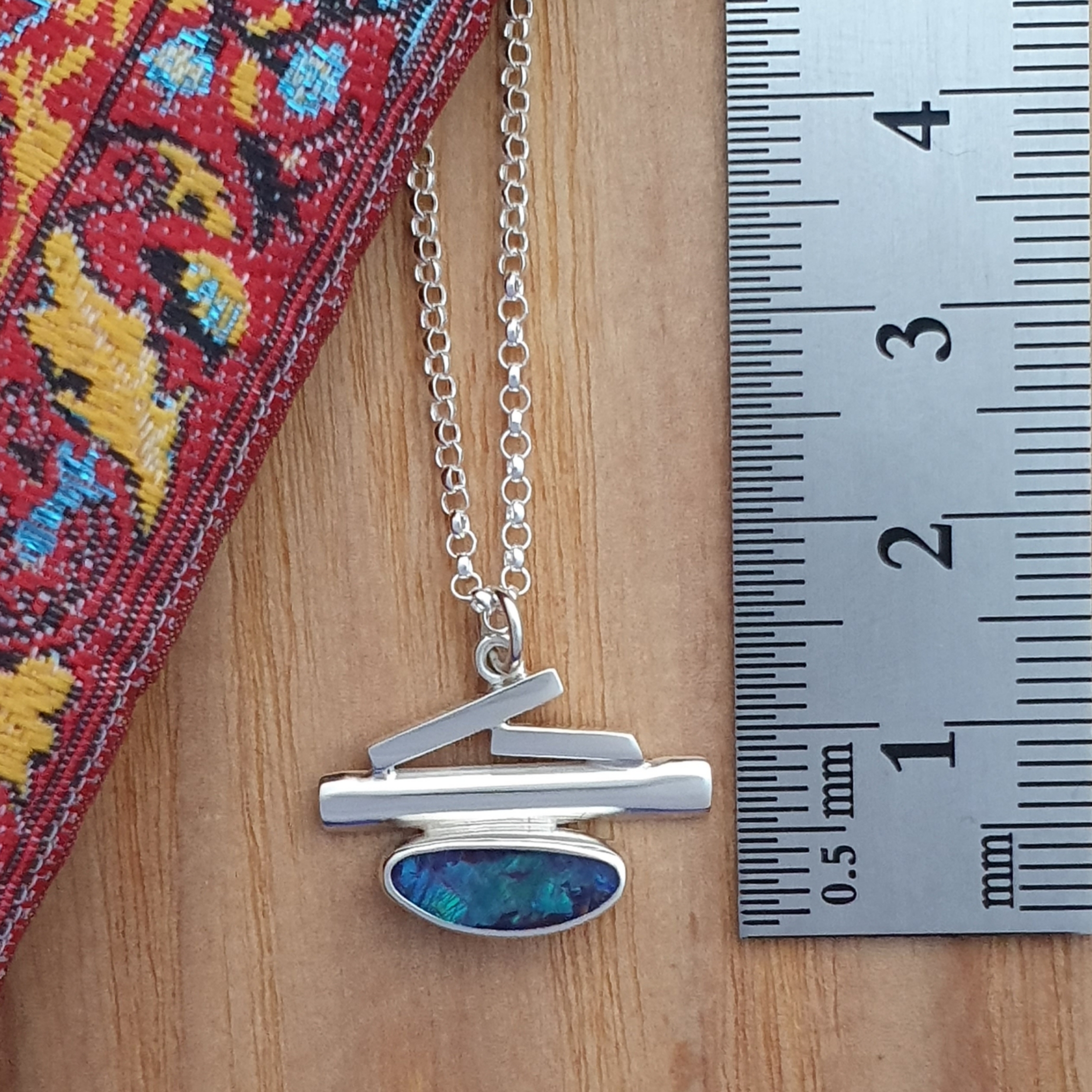 Sterling silver and red and blue Australian Opal doublet pendant on chain, handmade by Flying Lobster Jewellery. Opal 11 x 3.5mm. Length 17 x width 19mm. Chain 45cm. SW1417