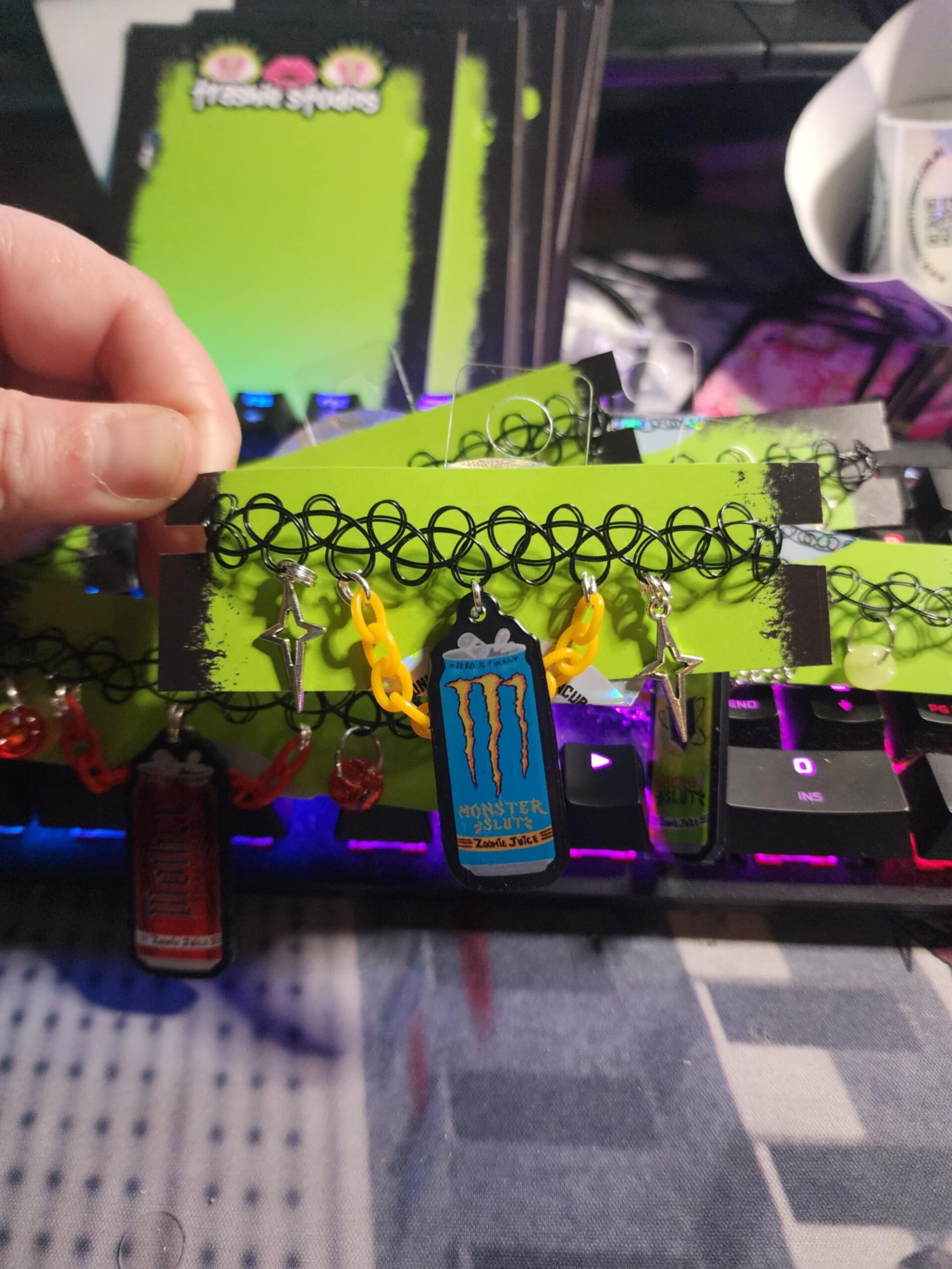 We sell hand-made chokers, hair clipz, art prints, stickers, stickers sheets, keychains & hair peices. Our practice is based around the 90s-2000s & now gothic/alt subcultures. Specifically the cryptid, weirdcore, nostalgiacore & kawaii.