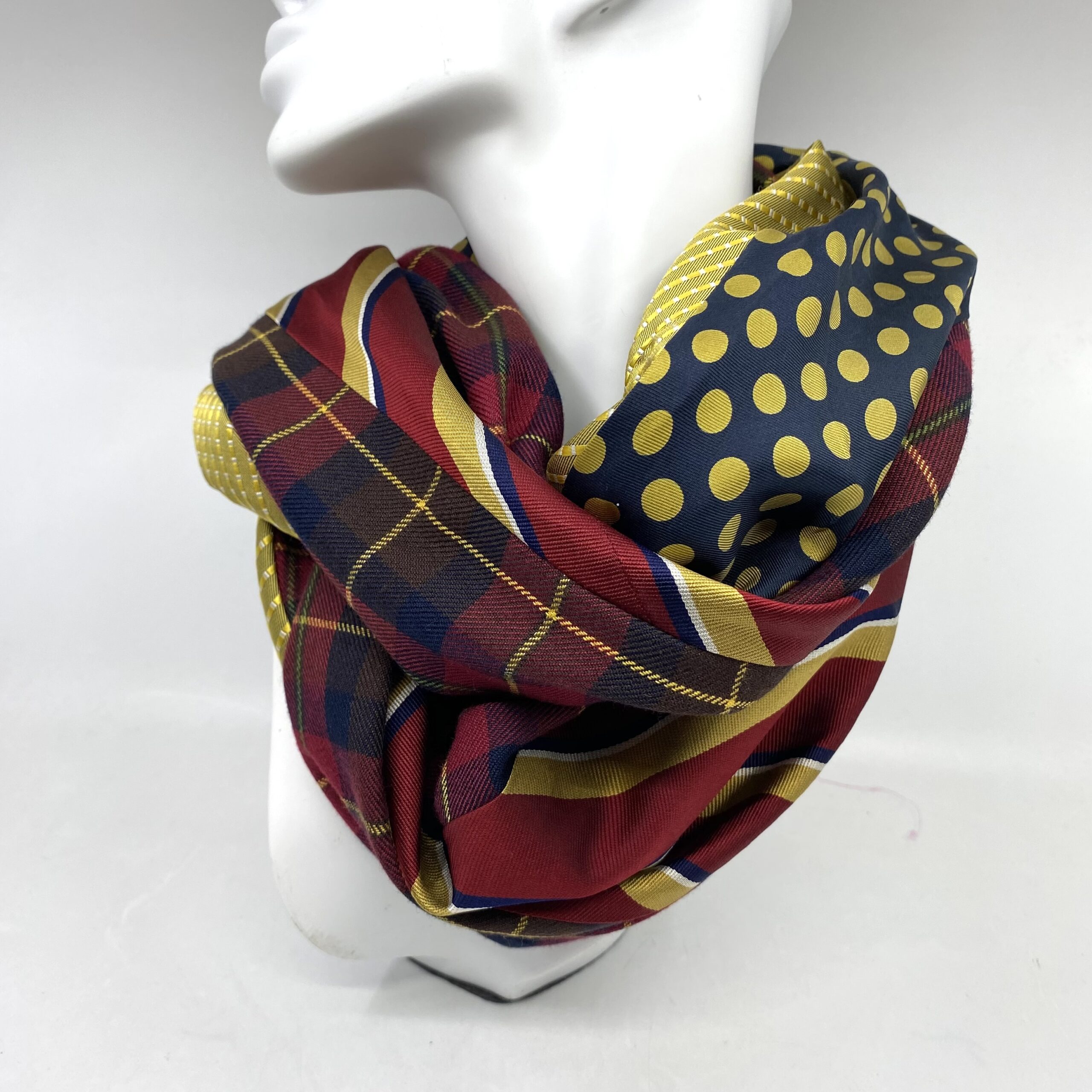 Who knew tartan could be so much fun! This silk-wool infinity scarf reimagines tartan by pairing it with bold silks in mustard, deep red and black. Spots and stripes in bold colour contrasts are a perfect foil to traditional tartan. This infinity scarf upcycles 4 complementary silk ties and deadstock fine wool tartan as a gorgeous winter accessory.