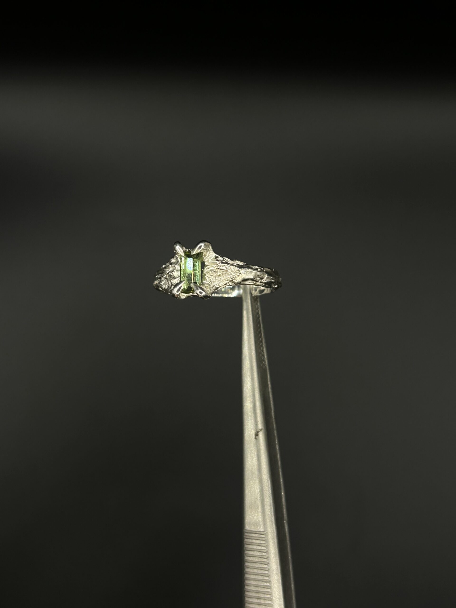 The Elven is a handmade ring full of irresistible magic. Green Tourmaline and Sterling silver meet to create a momentous ring that feels as if its origin started in an Elven forest and turns it into a wearable piece of art. The Green Tourmaline paired with the textured Sterling Silver is truly magical and made for its wearer to be transported into a world of endless possibilities & enchantment. This would make a wonderful pinky or statement ring