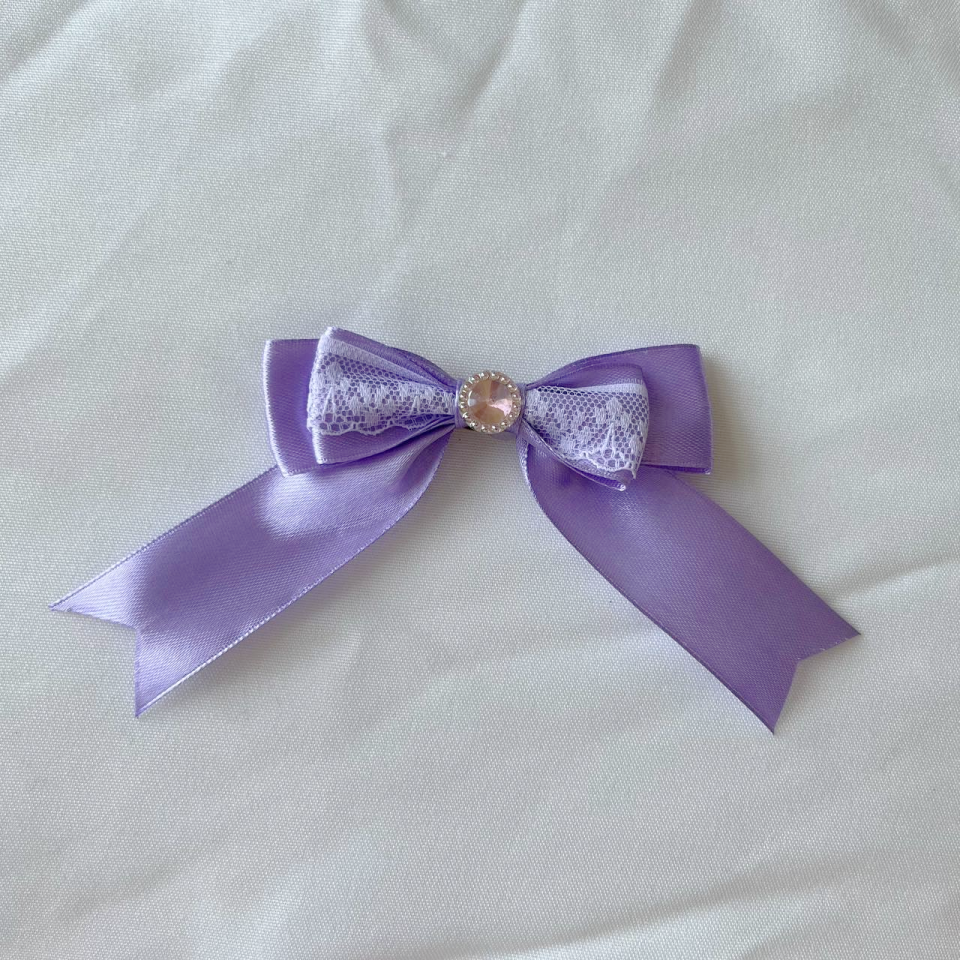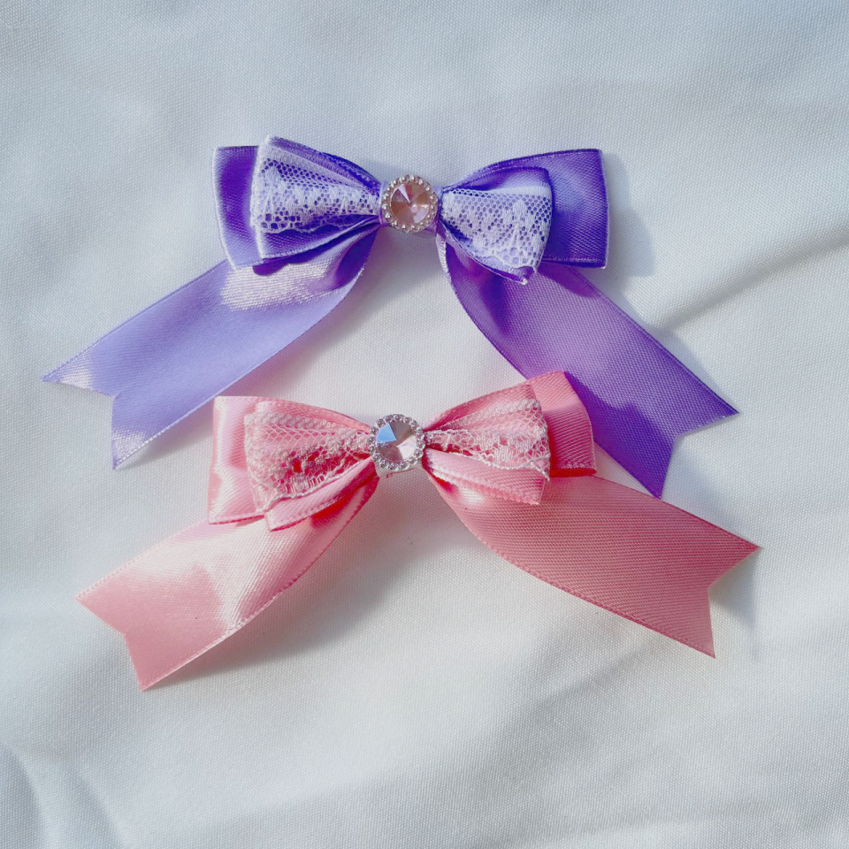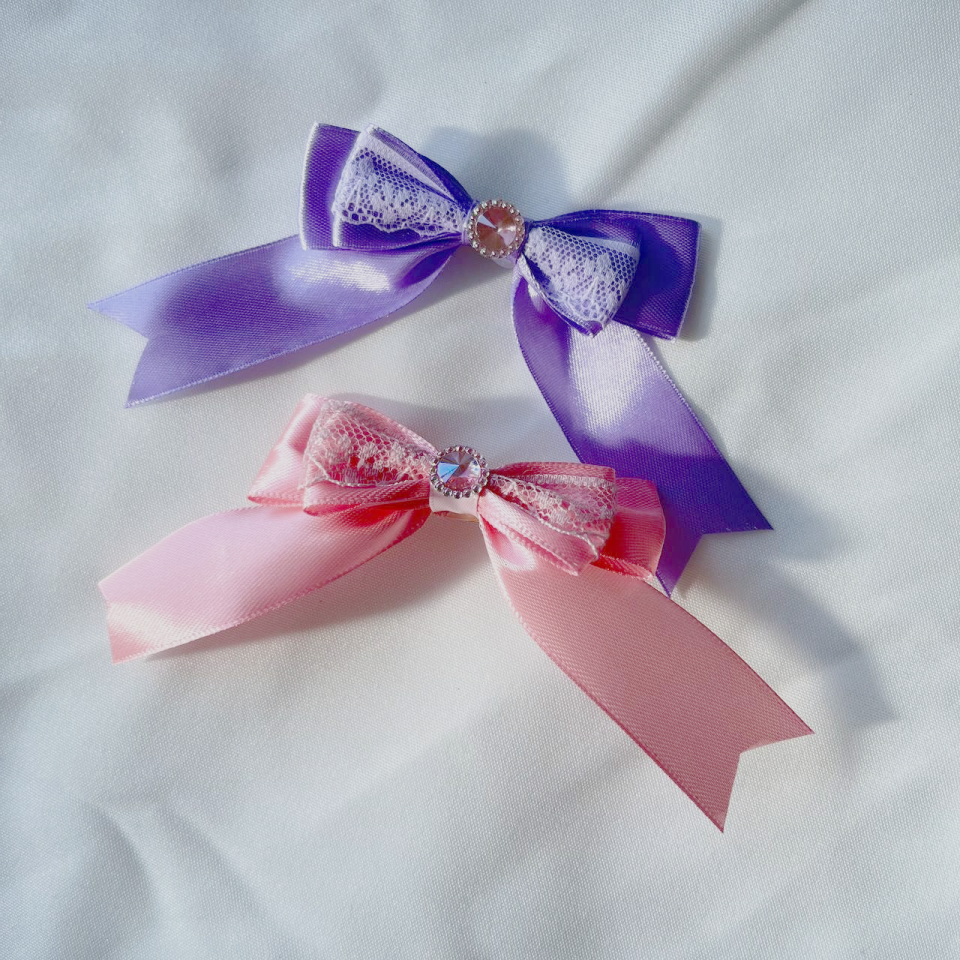 Comes in purple or pink! Each tiny bow is topped with a cute circle pink gemstone in its centre, and has a brooch pin backing for easy attachment to your outfit!