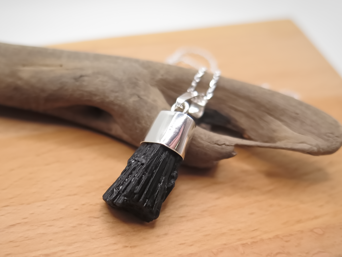 A small raw crystal in black tourmaline encased in sterling silver and hanging from a sterling silver adjustable chain,