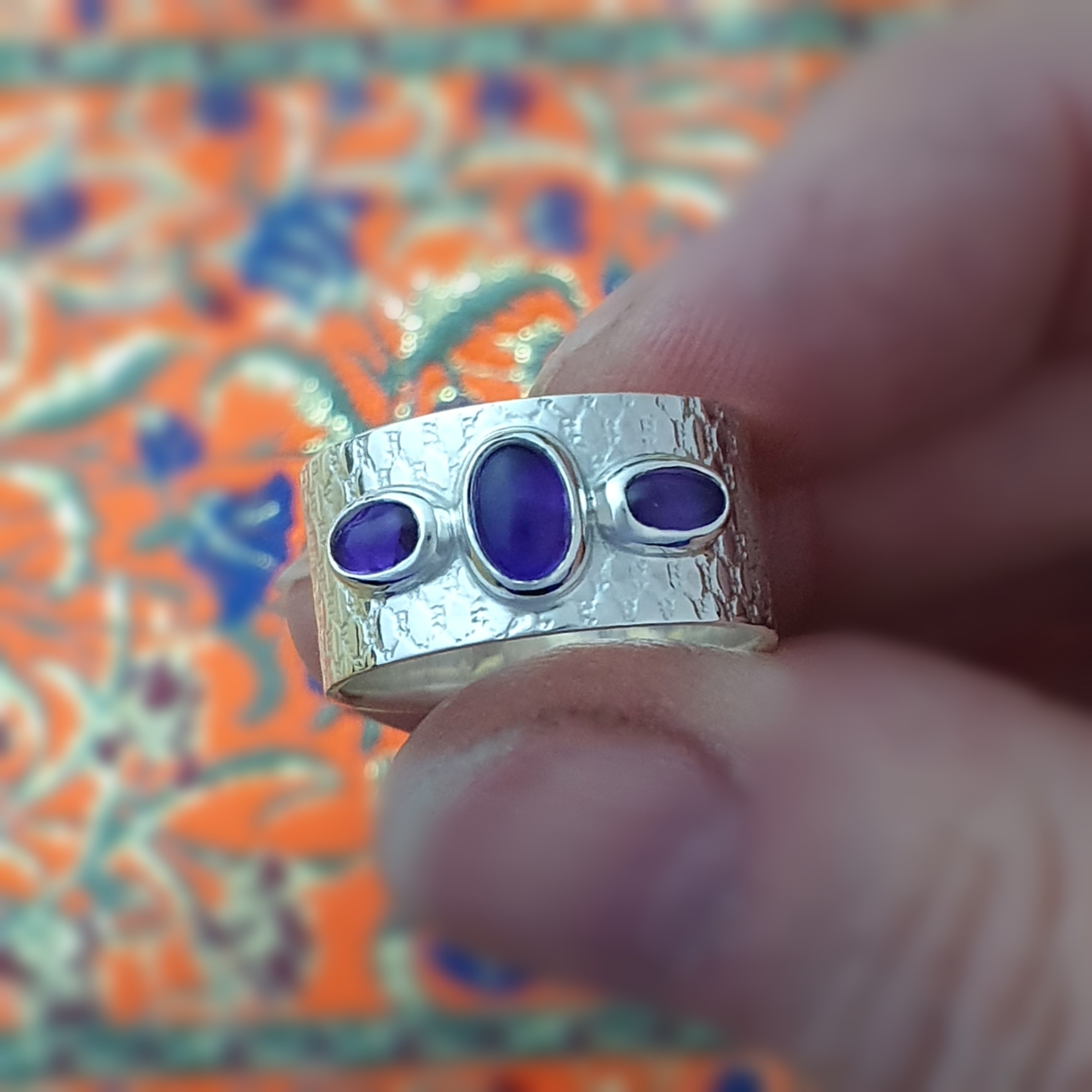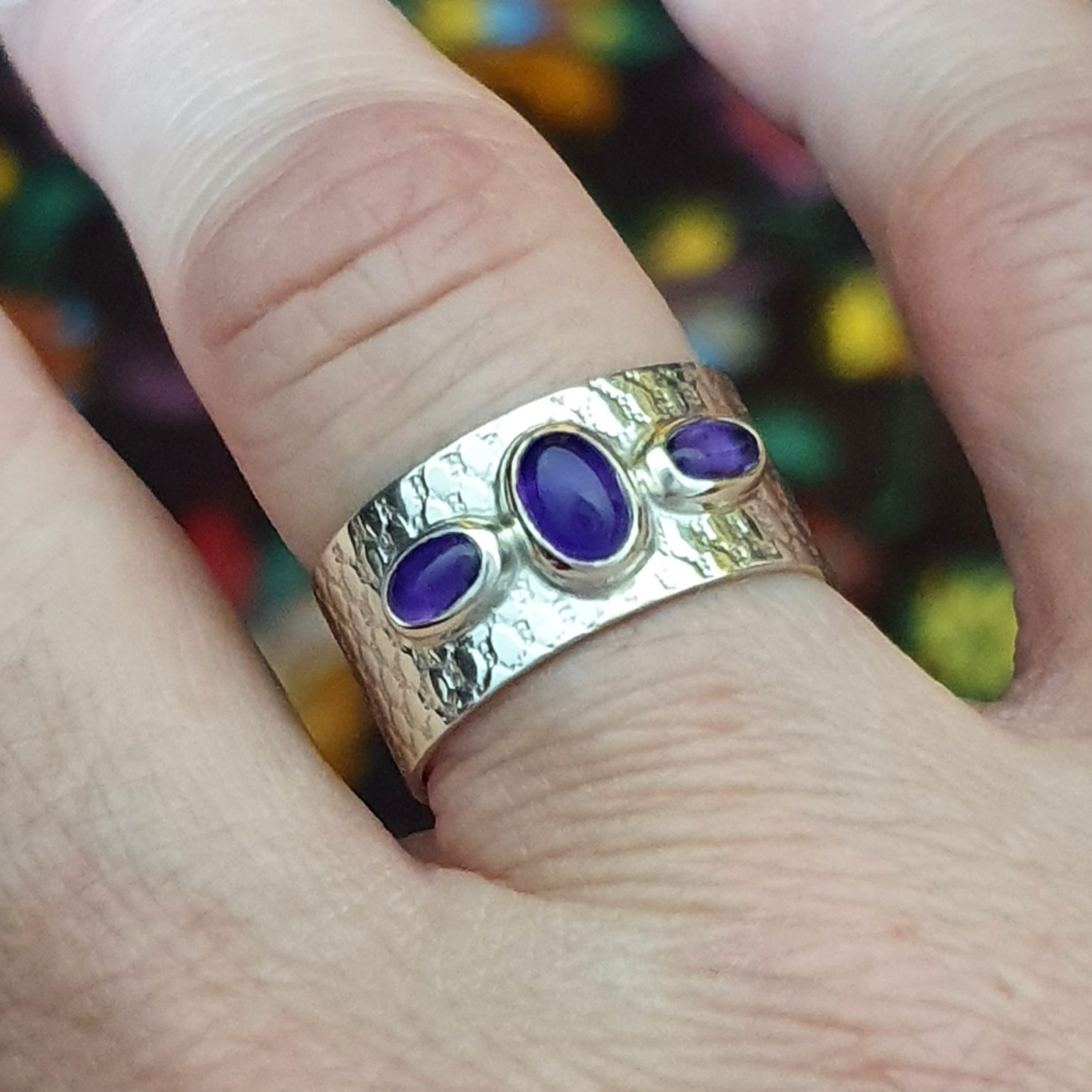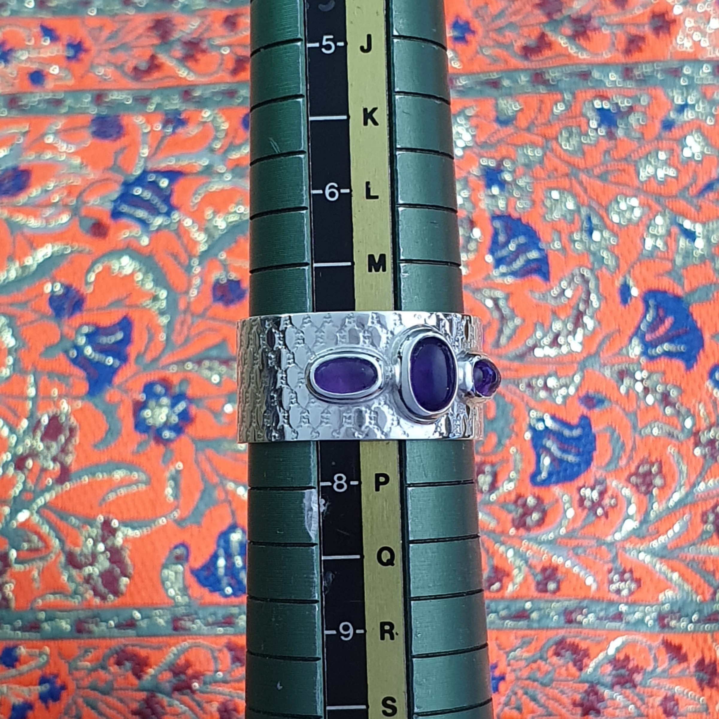 Sterling silver textured band set with 3 oval Amethyst cabochons, handmade by Flying Lobster Jewellery. Amethysts 6x5mm and 5x3mm. Band width 10mm. Size O 1/2. SW1460