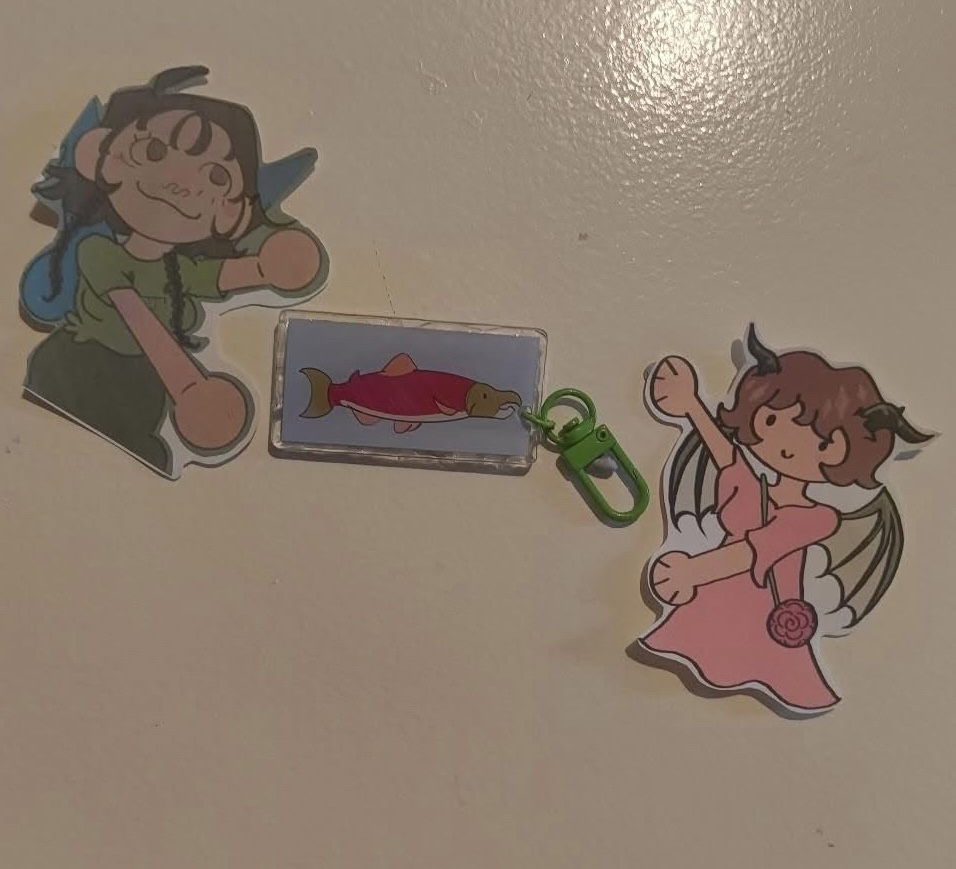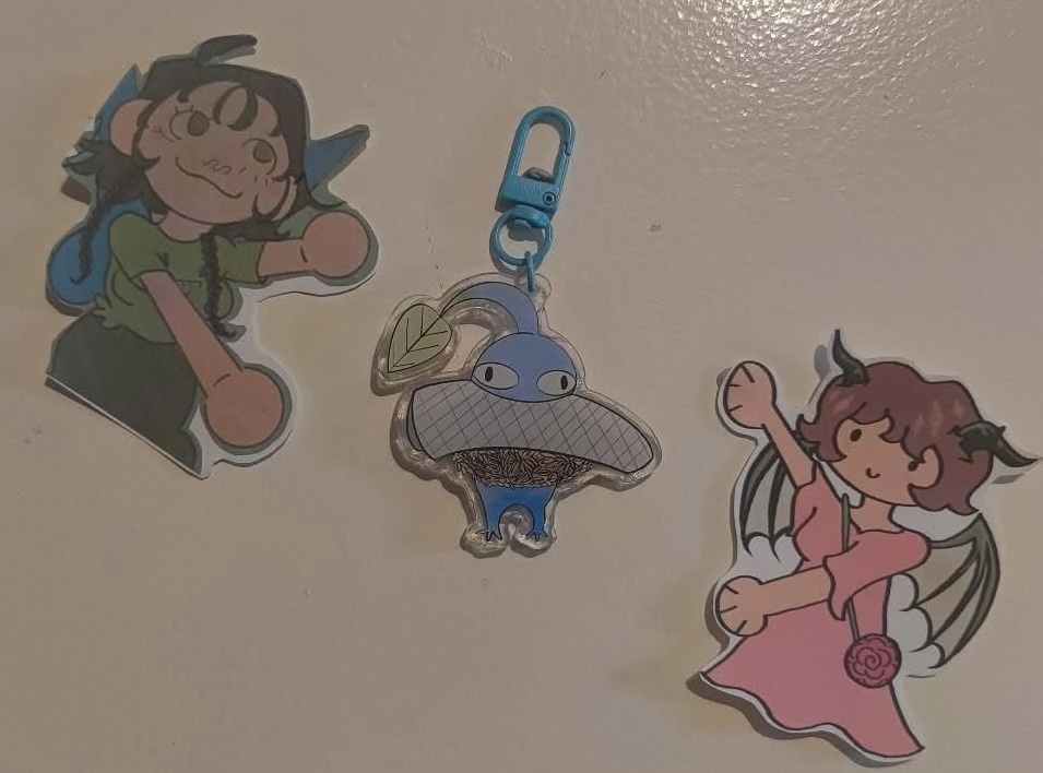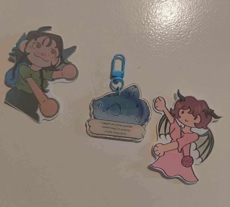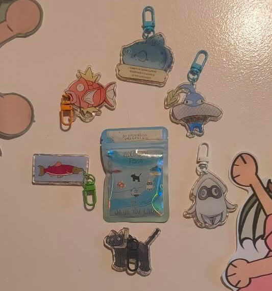 acrylic charm keychain of 6 different fish related characters found in their respective video game’s, one single pack comes with one random charm