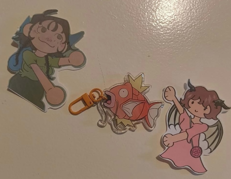 acrylic charm keychain of 6 different fish related characters found in their respective video game’s, one single pack comes with one random charm, with a 2/12 chance to get the mystery charm.