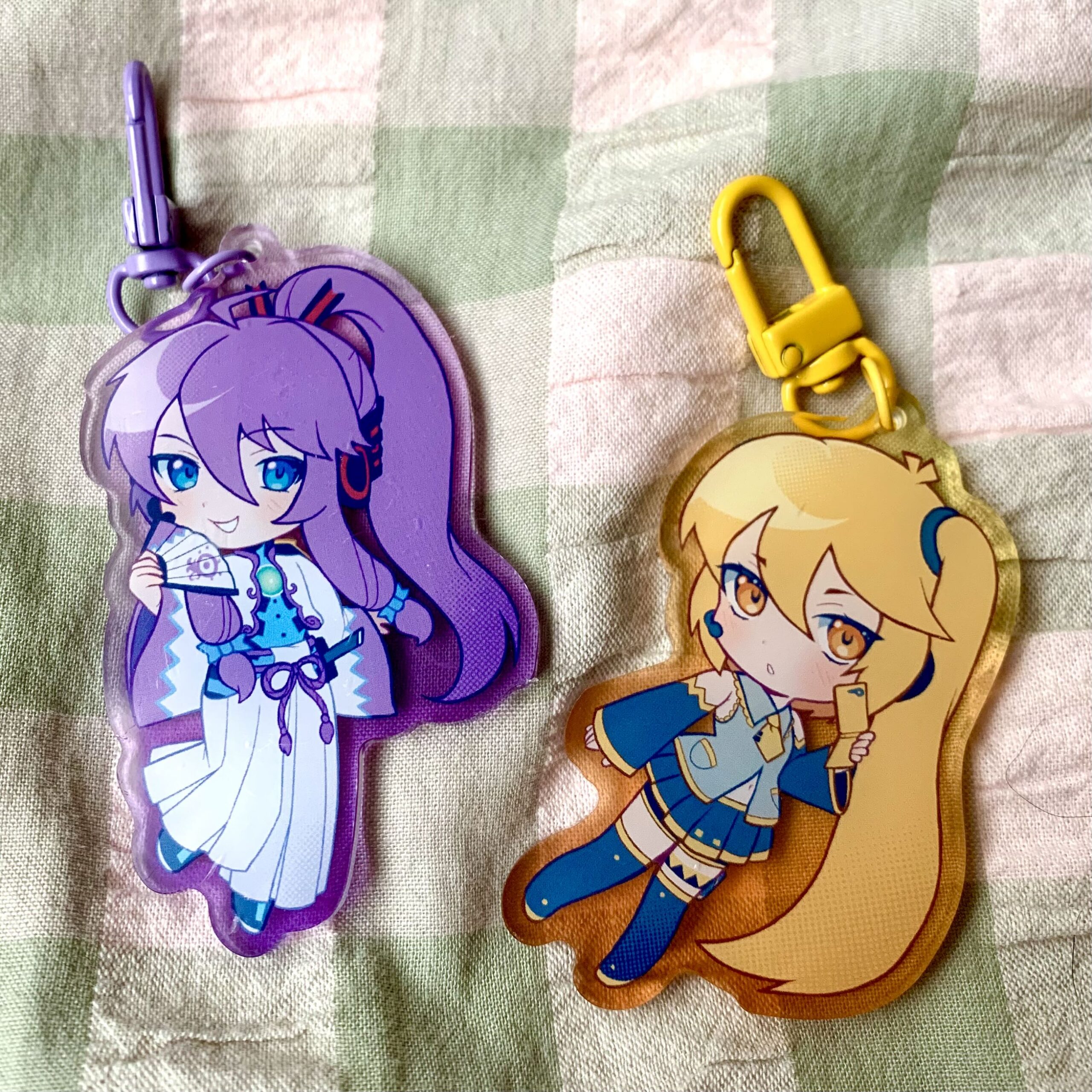 Fan-made coloured acrylic keychains featuring Vocaloid characters!