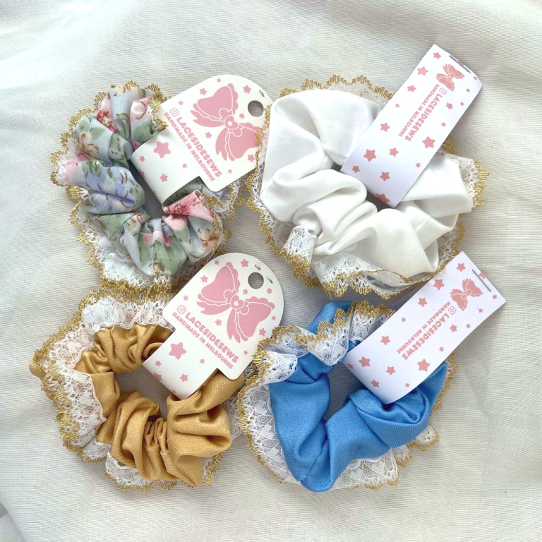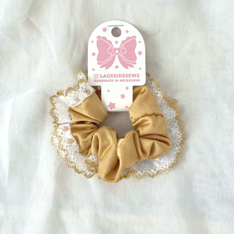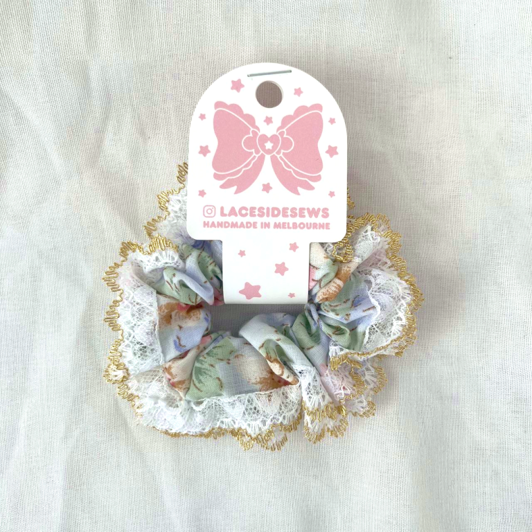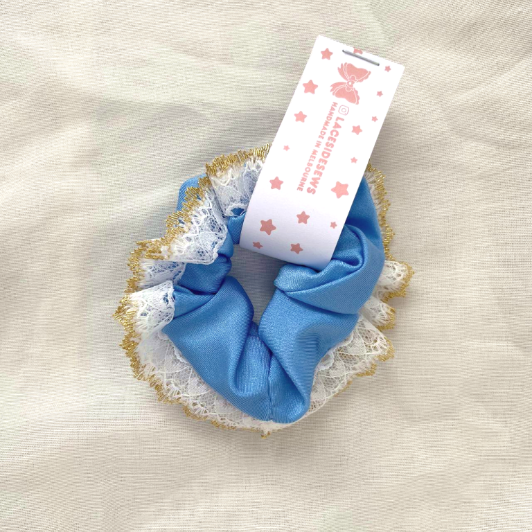 White and Gold Lace Scrunchie, comes in a flower pattern, blue, white, and yellow.