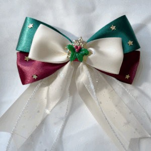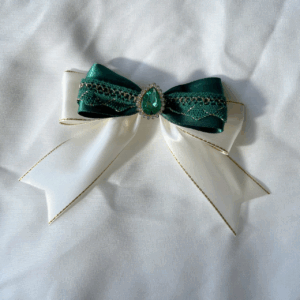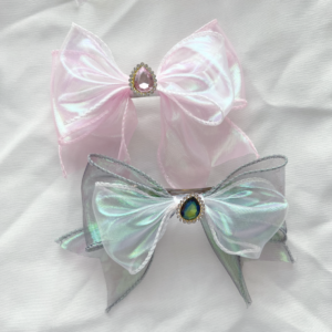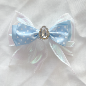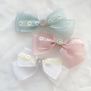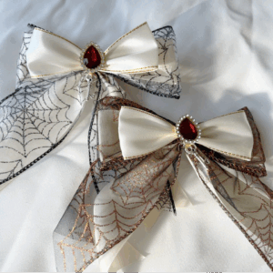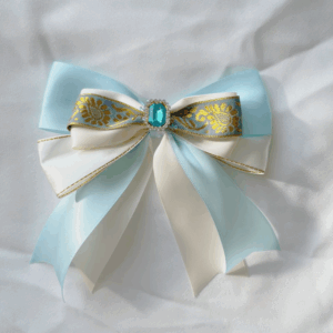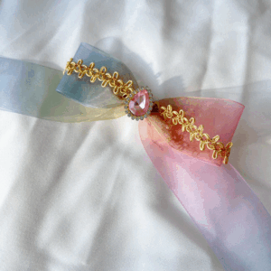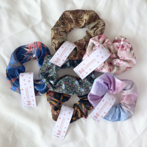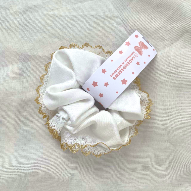 Give your hair an elegant shiny touch with this white and gold lace scrunchie! The base fabric colours come in shimmery blue, white, yellow, and pale blue with a sweet flower pattern.