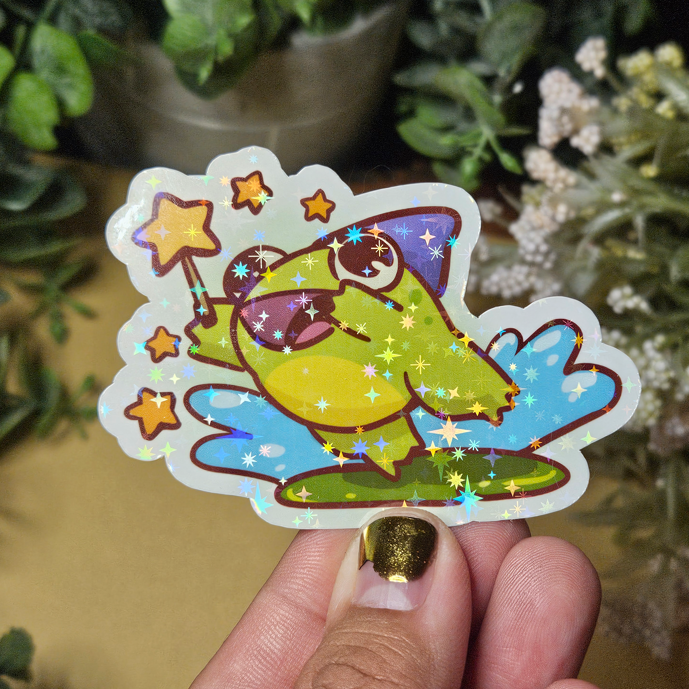 This sticker set features 5 Waterproof Holographic Wizard and Witch Animals!