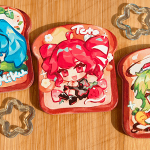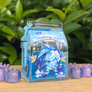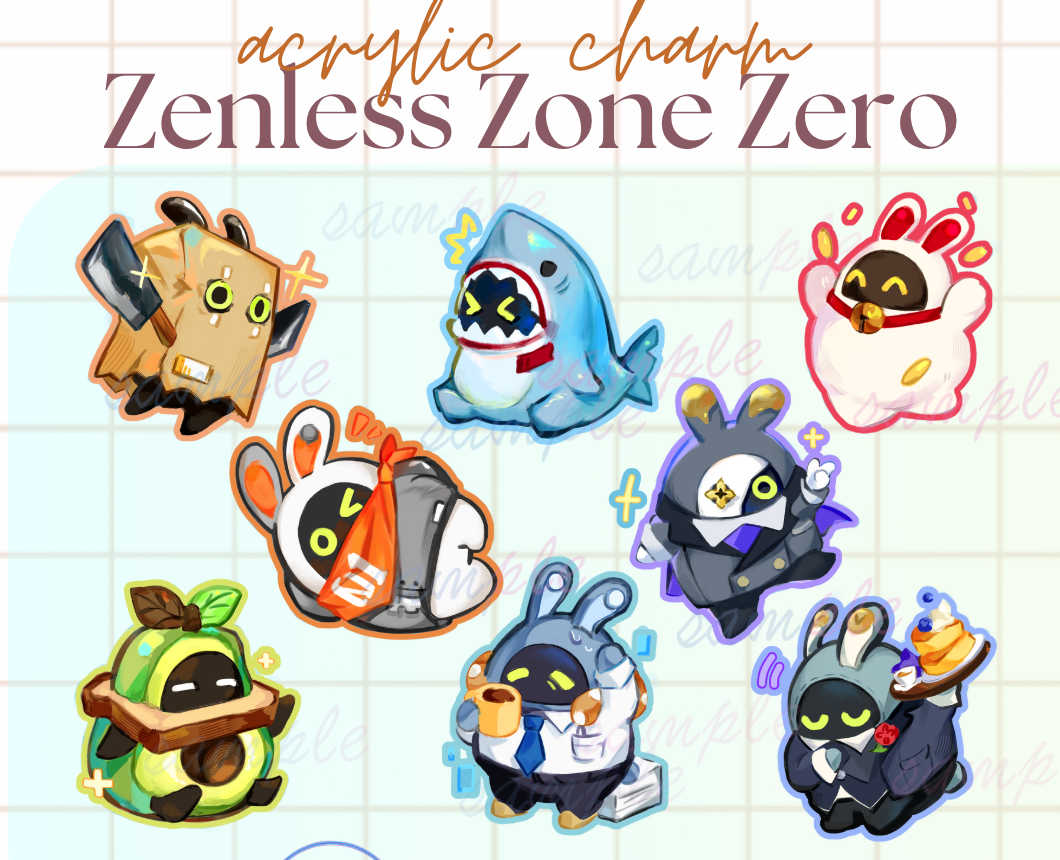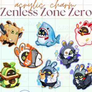 Fan-made ZZZ keychains designed by Gallu_illust. Features a smooth bevel cut with double sided printing, front side glitter. All charms in this series are 2″ (5cm~) with a metallic ball chain clasp in a vary of colours.